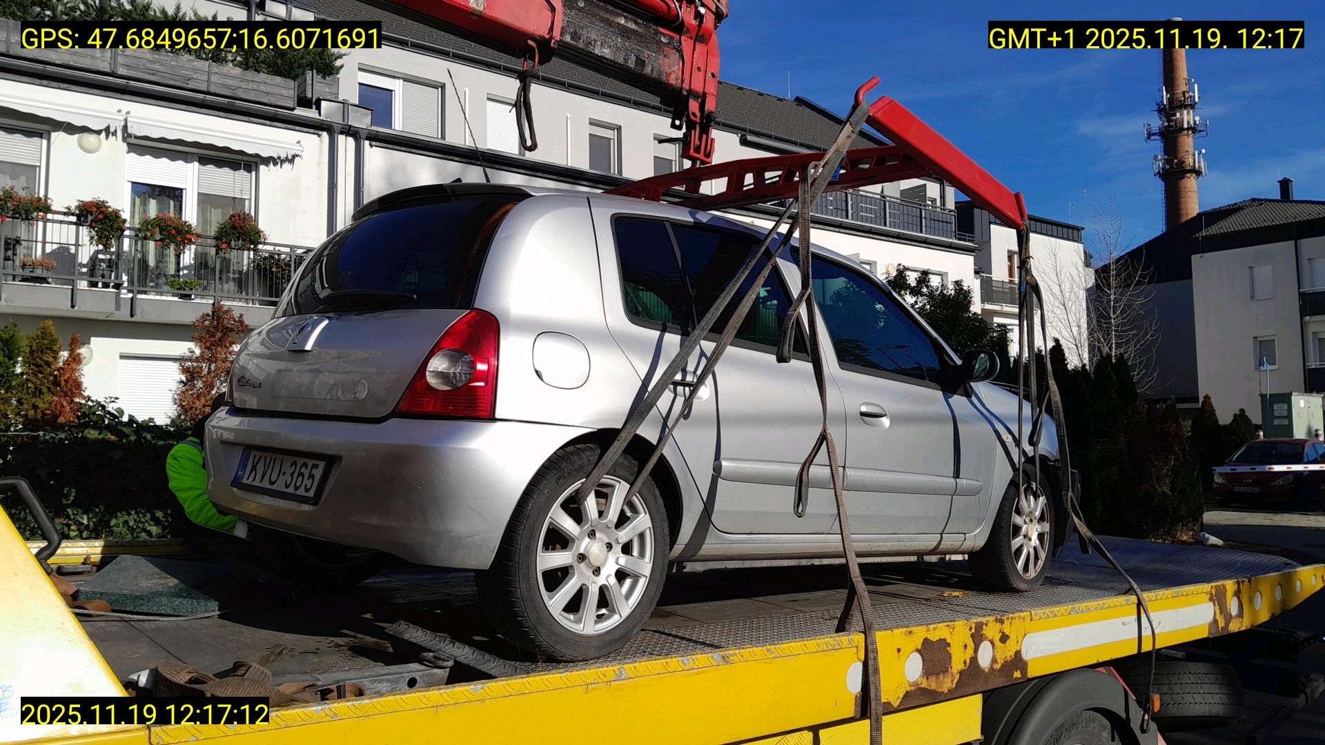 2025. november 19-én 12 óra 17 perckor elszállított gépjármű Szabálytalan tárolás miatt Sopron, Ravazd utca 73. előtt parkoló KVU-365 forgalmi rendszámú szürke színű Renault Clio típusú gépjármű elszállításra került. Érdeklődés esetén a Közterület-felügyelet elérhetősége: 06/99 515-481