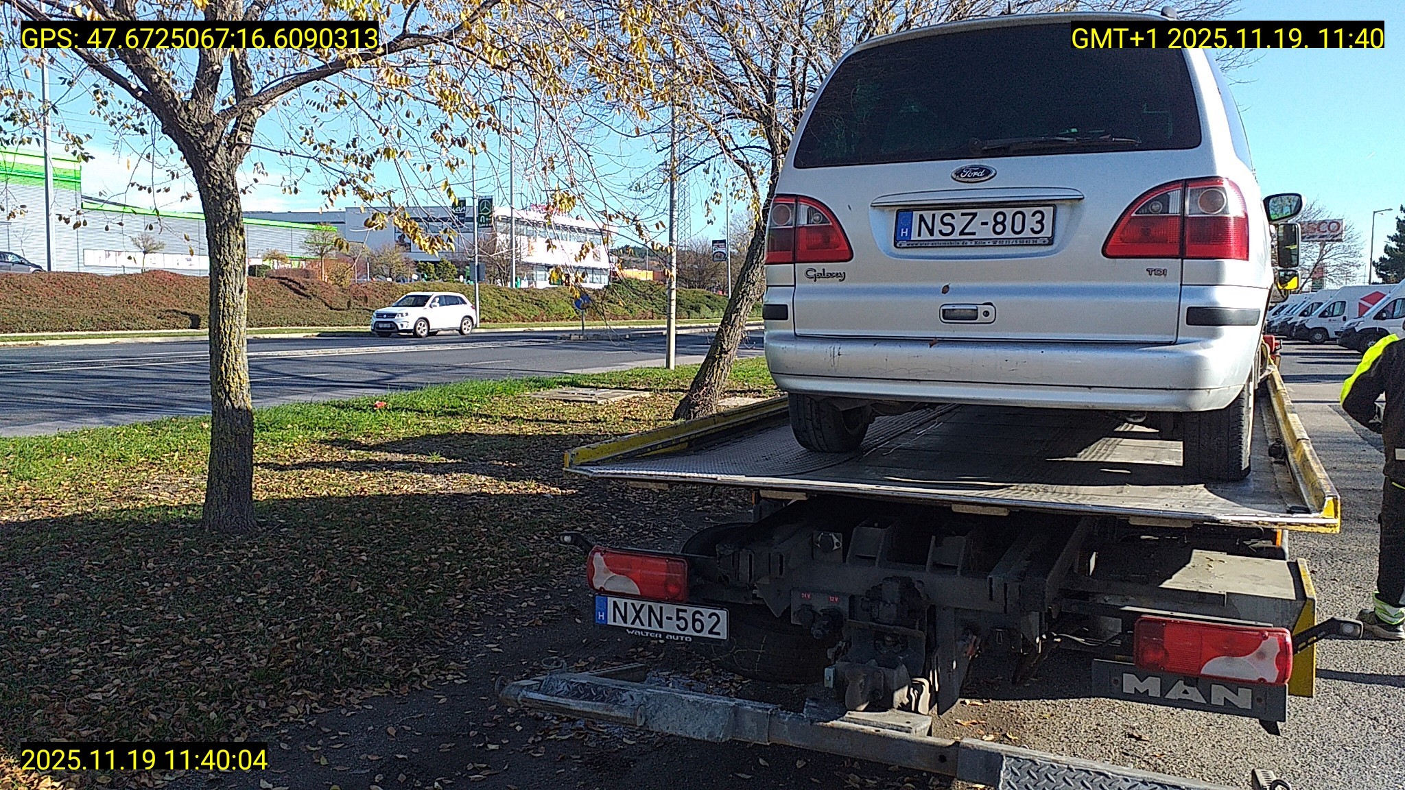 2025. november 19-én elszállított gépjármű 2025.11.19-én, a Győri út 48/A elől elszállítottuk az NSZ-803 rendszámú Ford Galaxy gépkocsit