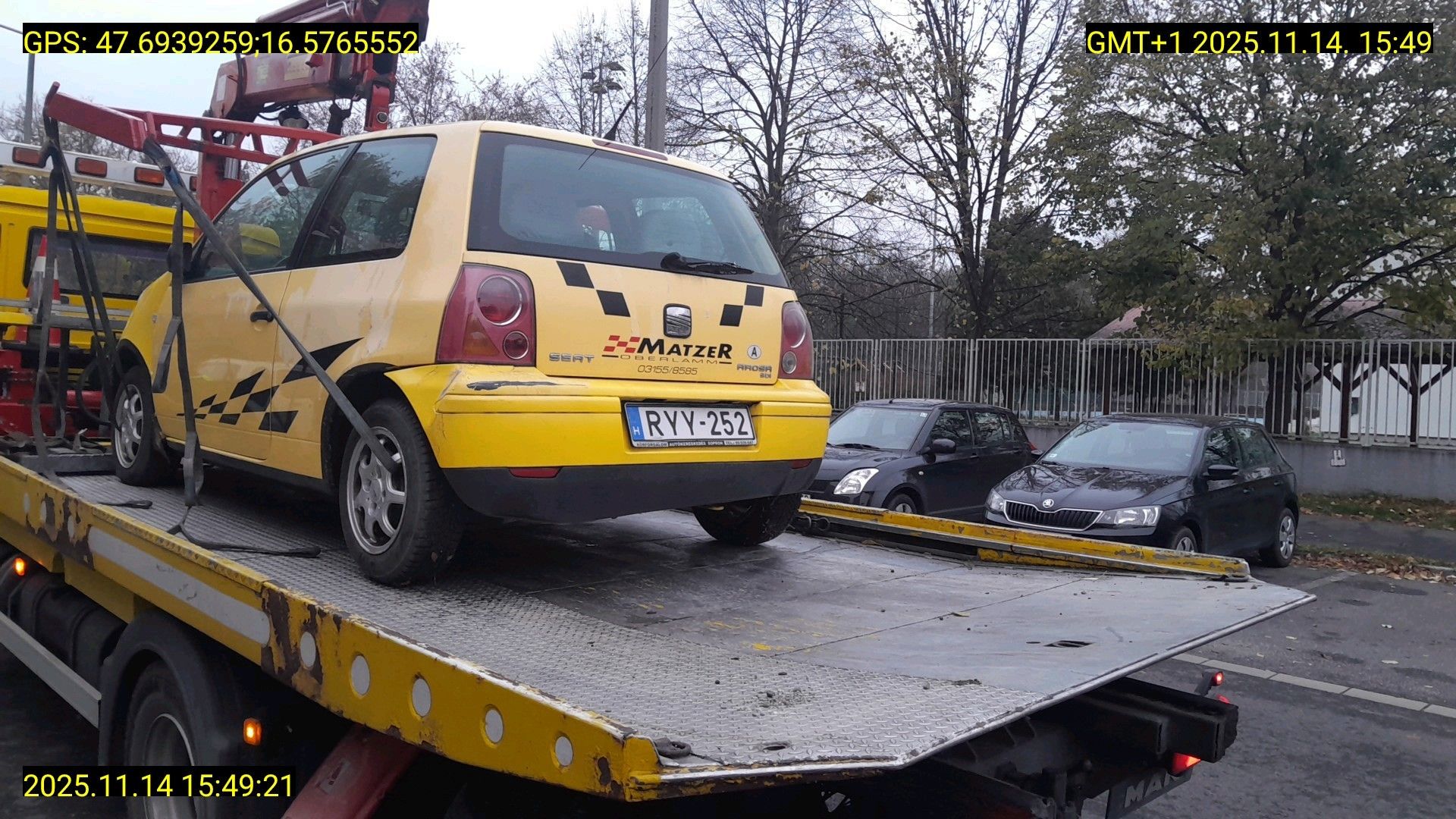 2025. november 14-én 15 óra 49 perckor elszállított gépjármű Szabálytalan tárolás miatt Sopron, Soproni Horváth József utca 7. előtt parkoló RYY-252 forgalmi rendszámú sárga színű Seat Arosa típusú gépjármű elszállításra került.